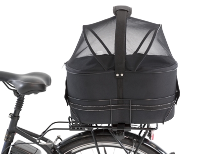 Trixie EVA Fietsmand Achterop Zwart met Kussen en Kap 48X29X42 cmDeze handige een stevige fietsmand is gemaakt van vormvast EVA. De fietsmand heeft een robuust metalen frame voor een veilig vervoer op de bagagedrager. De mand zit vast aan het frame met klittenband en kan worden losgemaakt van het frame. De overkapping van gaas is te openen, zodat de hond (of kat) eenvoudig in de mand geplaatst kan worden. Het gaas zorgt voor meer veiligheid en luchtcirculatie tijdens de fietsrit. De mand is voorzien van een geïntegreerde korthouder zodat jouw dier veilig in het mandje blijft zitten. Door de reflecterende strepen op de mand ben je bovendien goed zichtbaar en de gevoerde pluche bodem is comfortabel en uitneembaar.Houd tijdens het fietsen de mand voor de veiligheid van jouw dier altijd gesloten en jouw dier altijd aangelijnd aan de korthouder.
