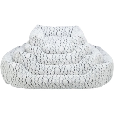 De Trixie Mand Mila Hoekig Pluche Wit/Grijs 50X40 cm is een originele hondenmand met een leuk patroon en zachte structuur pluche, met slipvaste onderkant. Deze mand is een ware blikvanger in jouw huis! De bijzondere stof heeft een leuk patroon van cirkels en is daarnaast heerlijk comfortabel door de zachte pluche structuur. De polyestervlies vulling zorgt voor voldoende steun en op de rand kan de hond fijn zijn kop laten rusten. Bovendien zorgen de lage instap in de rand en slipvaste onderkant dat het dier zonder moeite in- en uit de mand kan stappen.