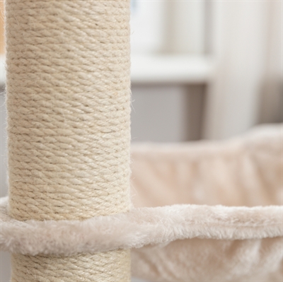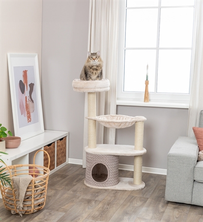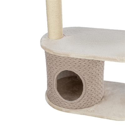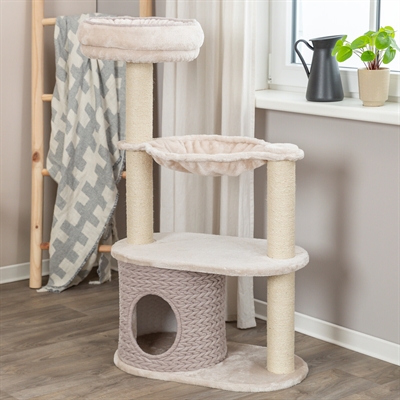 De Trixie Krabpaal Alessia Lichtgrijs/Zand 65X38X114 cm is vervaardigd uit hoogwaardige materialen zoals jute, pluche en velours. Het gevoerde ligplateau biedt extra comfort en wordt geleverd met een afneembare relax-mand. De schuilplaats, gemaakt van zacht velours, biedt je kat een knusse plek om te rusten. Daarnaast is de krabpaal uitgerust met een hangmat, perfect voor ontspanning. Ideaal voor katten die graag krabben, spelen en ontspannen in stijl.- Krabpaal met krabvlakken van jute