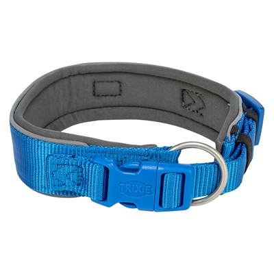 De Trixie Premium Halsband Hond Extra Breed Royal Blauw/Grafiet Grijs 53-62X5 cm is een half-slip halsband zonder ketting, van stevig en extra breed polyester. Een ideale halsband voor honden die iets te enthousiast zijn aan de lijn, maar voor wie liever geen gebruik maakt van een slipketting. Deze halsband is gemaakt van stevig maar comfortabel polyester met een voering van neopreen. Door de handige constructie komt de halsband iets strakker te staan bij veel druk, maar zorgt de gesp, die je zelf kunt verstellen voor het juiste formaat, voor een blokkade die voorkomt dat de halsband volledig strak trekt. Eenvoudig om- en af te doen én voorzien van een gesp die losschiet bij teveel druk. De stiksels in de band zijn reflecterend, waardoor jouw hond goed opvalt in het donker.